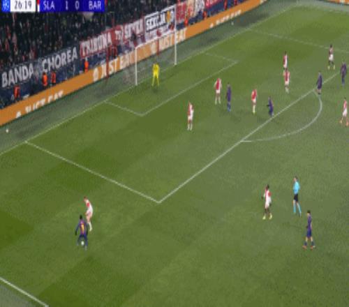 第34分钟,德容直塞,费尔明小角度抽射破门,巴萨1-1布拉格斯拉维亚