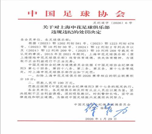 今天中午,中国足协官网发布《中国足球协会关于对有关涉案俱乐部及人员行业处罚情况的通报》,公布对涉案俱乐部的处罚决定。罚单明确,上海申花在2015年至2021年期间,违背体育道德、丧失体育精神、为谋取不当利益进行不当交易。因此足协依据纪律准则相关规定,对申花处以扣除2026赛季联赛积分10分、罚款100万的处罚。