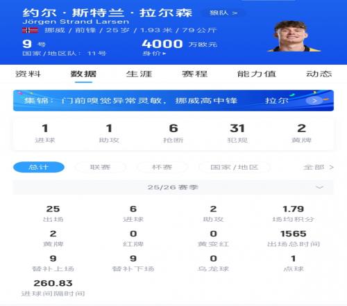 拉尔森现年25岁,去年夏窗以3000万欧永久转会狼队,他本赛季为球队出场25次,贡献6球2助,现身价4000万欧,他与狼队的合同至2030年。
