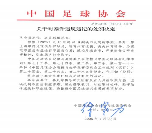 体育播报01月29日宣 足协发布“假赌黑”处罚结果,原上海申花足球俱乐部球员秦升,进行不正当交易,操控足球比赛,被终身禁足。